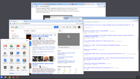 You can switch between the desktop mode and the Metro mode by clicking the menu and selecting "Relaunch Chrome on the desktop/in Windows 8 mode". Relaunching Chrome on the desktop didn't work well for me: only one of the windows was properly restored. "Chrome remembers the mode you last used. For example, if you exit Chrome from your desktop, you'll automatically be in desktop mode the next time you open Chrome," explains Google.