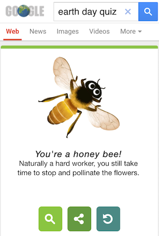 "Earth Day is a great time to search for information on how to celebrate and protect our planet – and it’s now a great time to find out something about yourself too. In a doodle first, clicking on this year's Earth Day logo (or searching for 'Earth Day quiz') presents one of the Internet's favorite pastimes: a goofy quiz. Take the time to answer a few questions and you too can determine, share, and learn more about which animal most closely represents your personality. The quiz works on just about any up-to-date browsers on your mobile or desktop browsers, including the Android and iOS Google Apps. (We assure you it's all 100% accurate and scientific),"