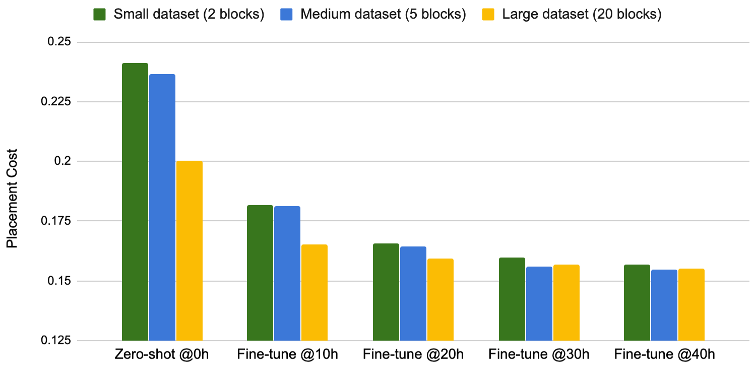 A computer chip is divided into dozens of blocks, each of which is an individual module, such as a memory subsystem, compute unit, or control logic system. These blocks can be described by a netlist, a graph of circuit components, such as macros (memory components) and standard cells (logic gates like NAND, NOR, and XOR), all of which are connected by wires. Determining the layout of a chip block, a process called chip floorplanning, is one of the most complex and time-consuming stages of the chip design process and involves placing the netlist onto a chip canvas (a 2D grid), such that power, performance, and area (PPA) are minimized, while adhering to constraints on density and routing congestion. Despite decades of research on this topic, it is still necessary for human experts to iterate for weeks to produce solutions that meet multi-faceted design criteria. This problem’s complexity arises from the size of the netlist graph (millions to billions of nodes), the granularity of the grid onto which that graph must be placed, and the exorbitant cost of computing the true target metrics, which can take many hours (sometimes over a day) using industry-standard electronic design automation tools.